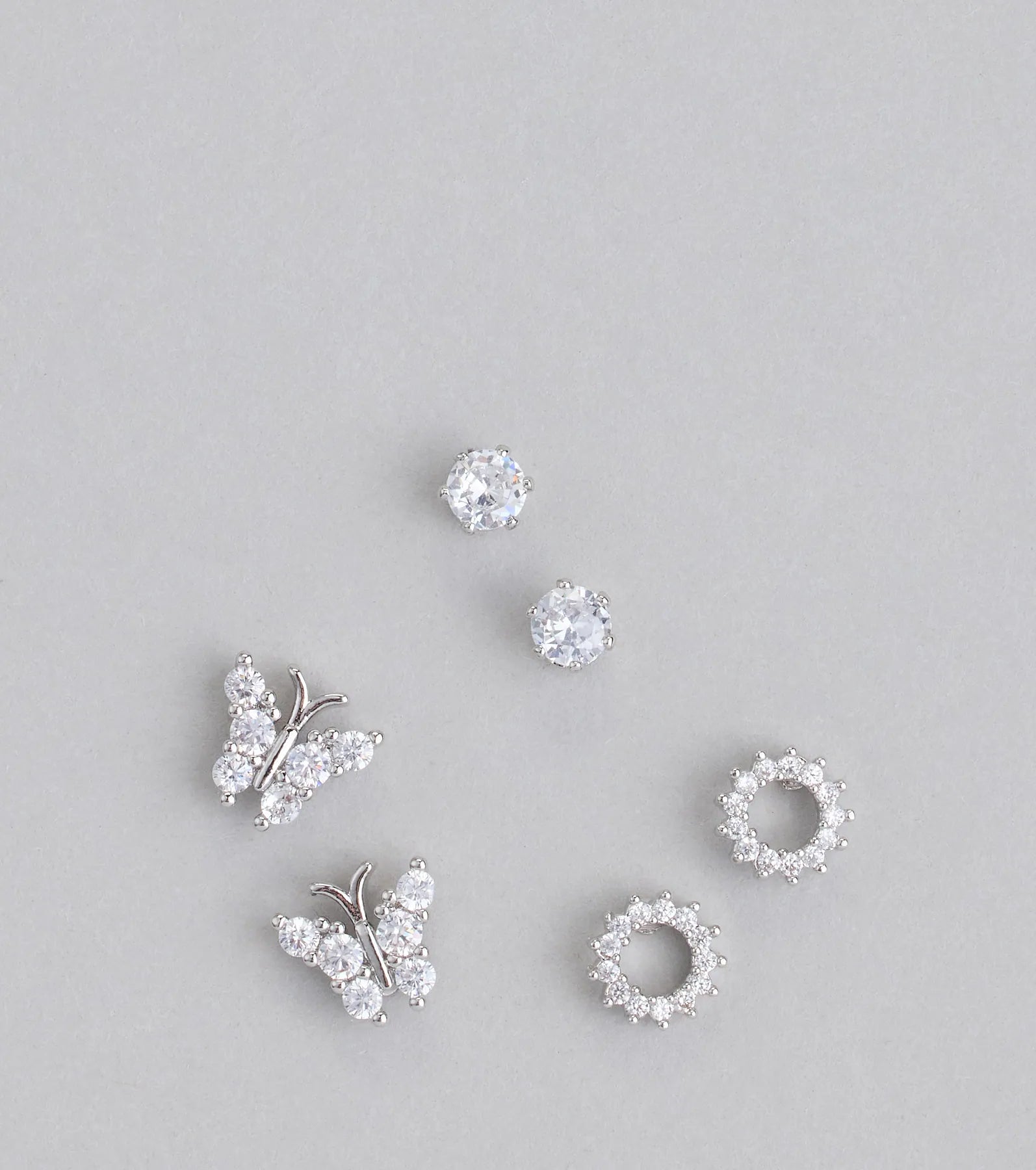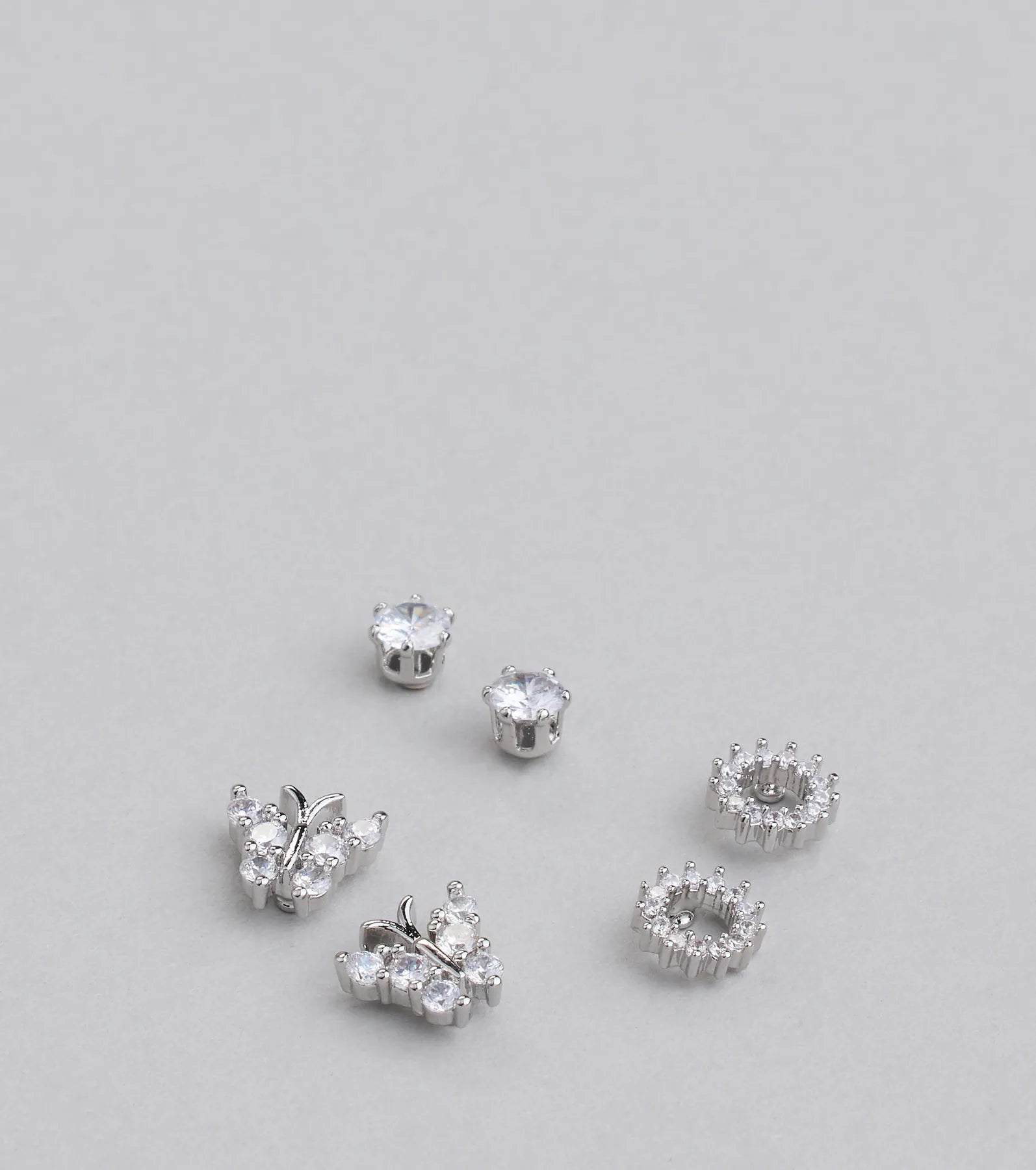 Fly high in these dainty glam three-pack stud earrings set! This pack includes three pairs of cubic zirconia embellished studs in unique designs that dress up any look.
