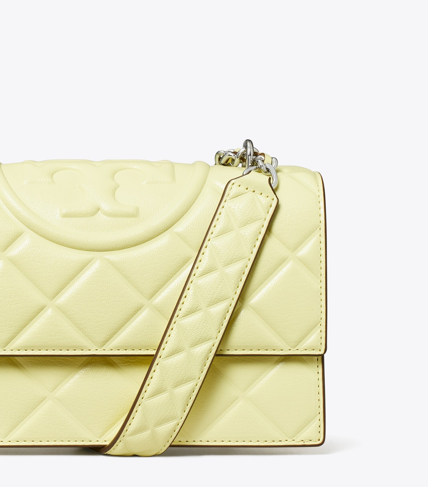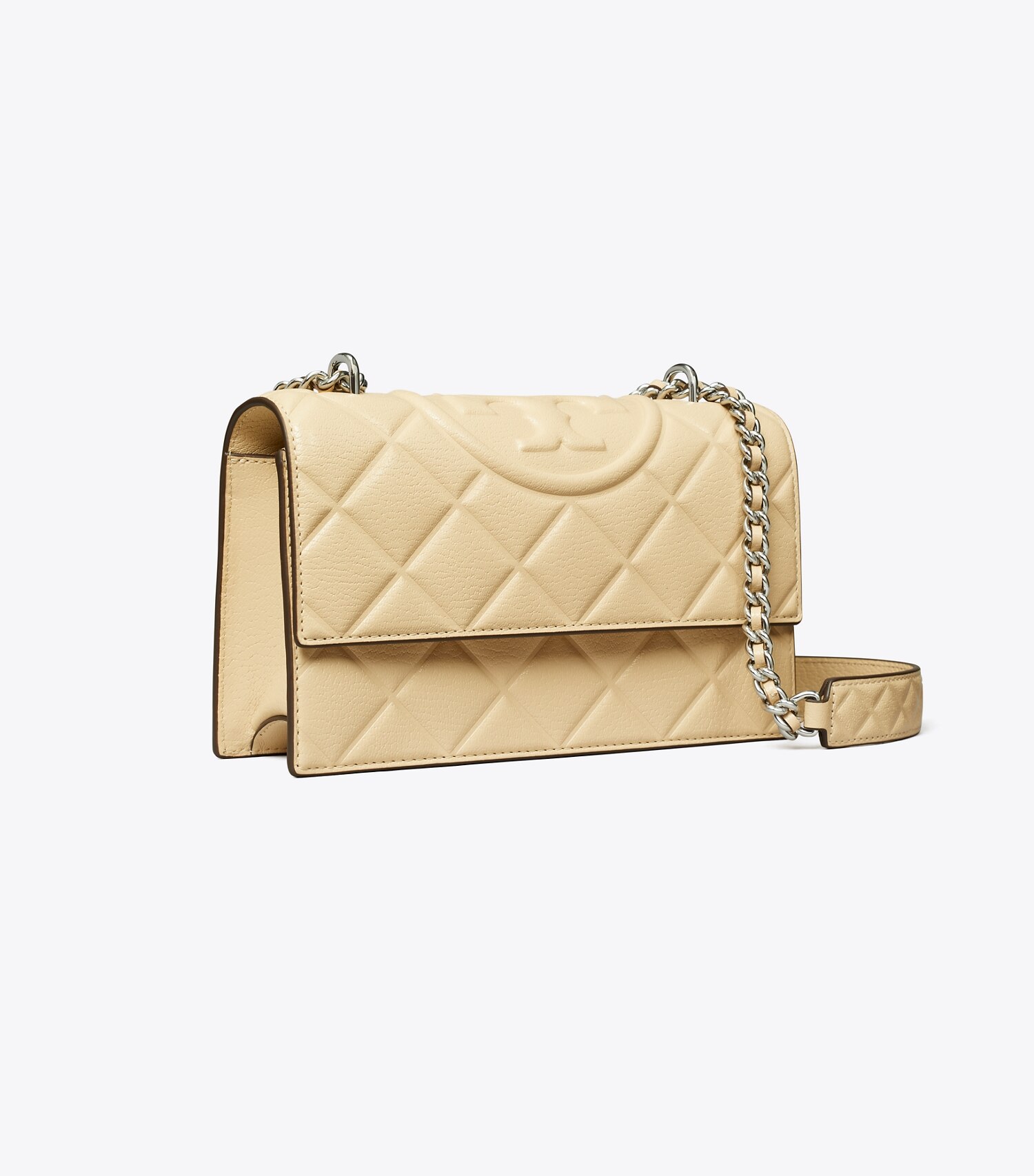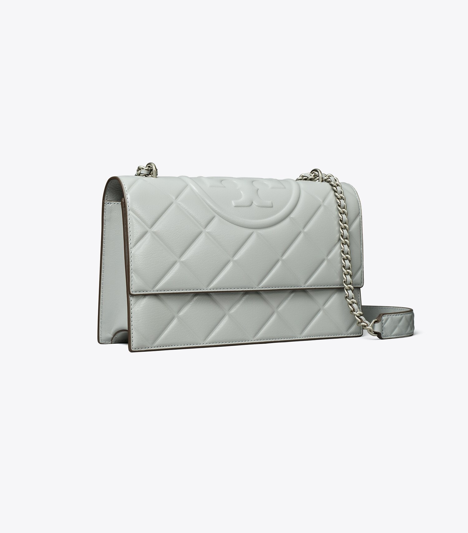 The Small Fleming Convertible Shoulder Bag playfully mixes the scale of diamond debossed quilting on the bag and strap. The adjustable chain, laced with leather, can be worn doubled over the shoulder or long and crossbody.