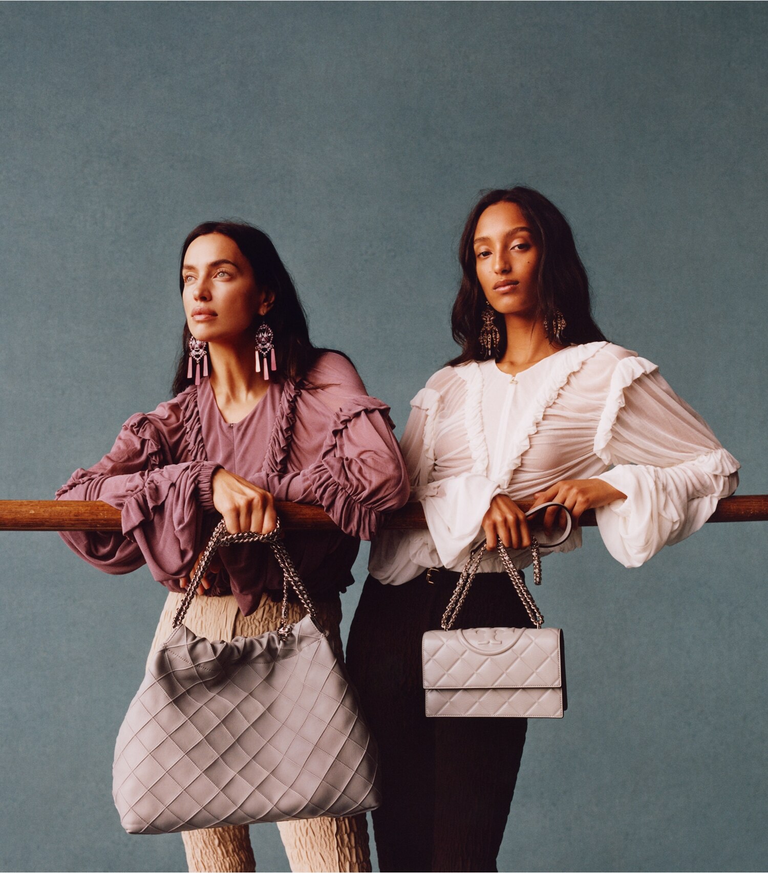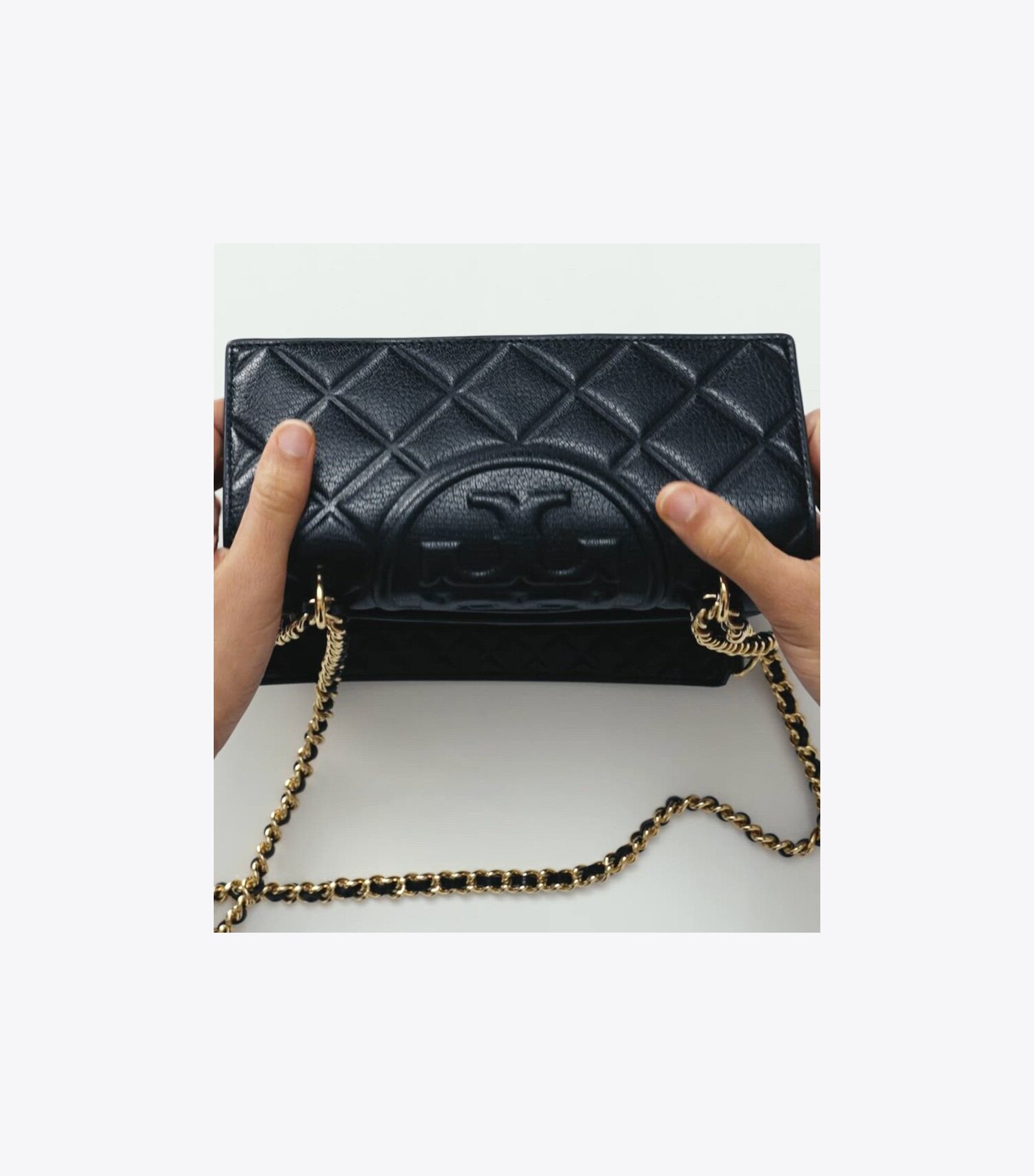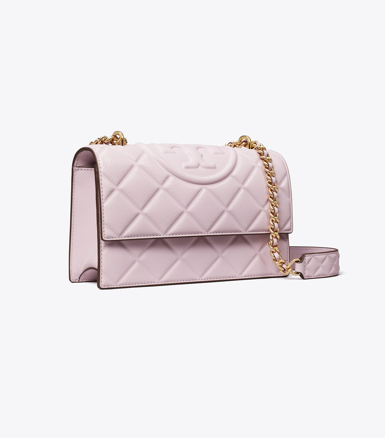 The Small Fleming Convertible Shoulder Bag playfully mixes the scale of diamond debossed quilting on the bag and strap. The adjustable chain, laced with leather, can be worn doubled over the shoulder or long and crossbody.