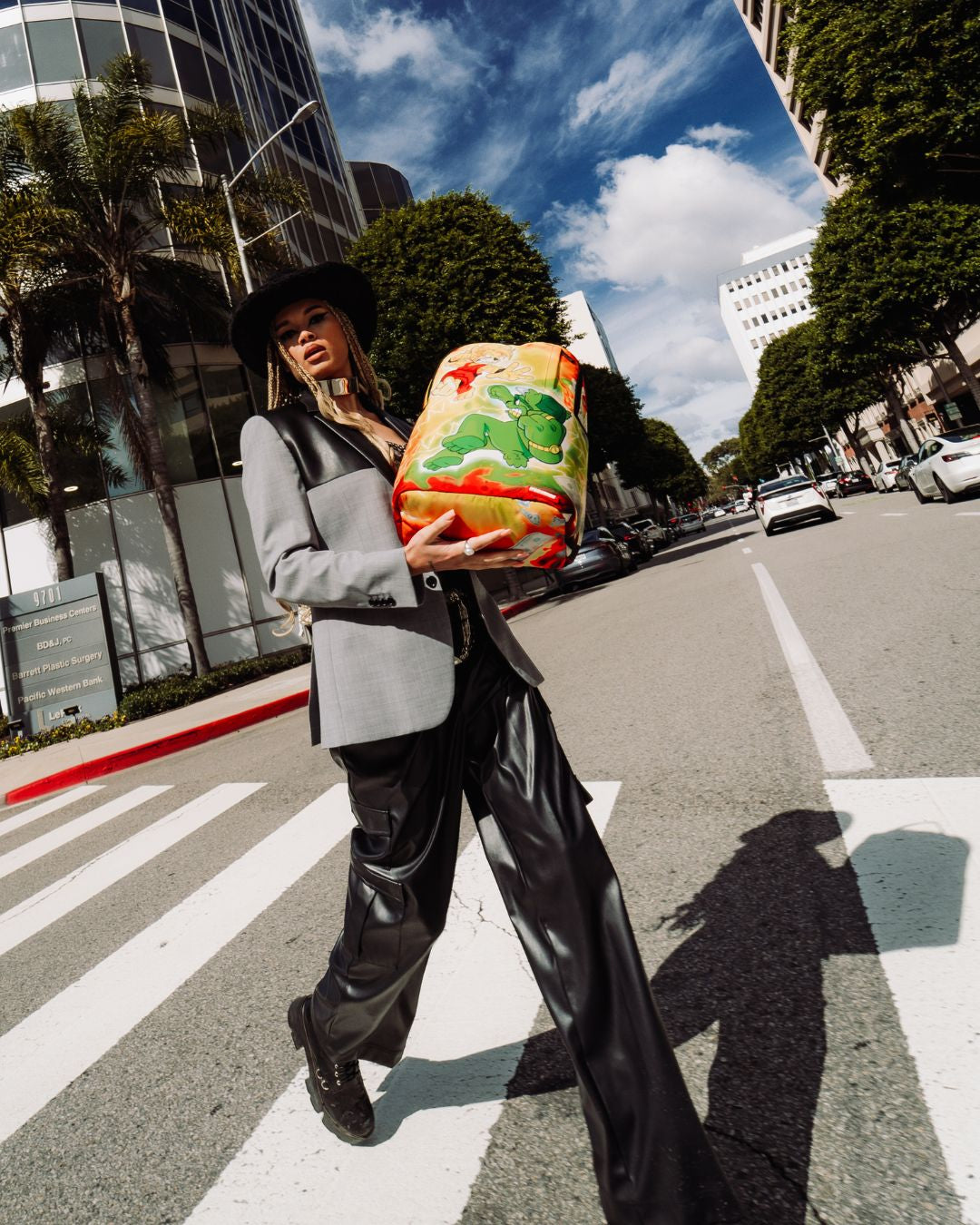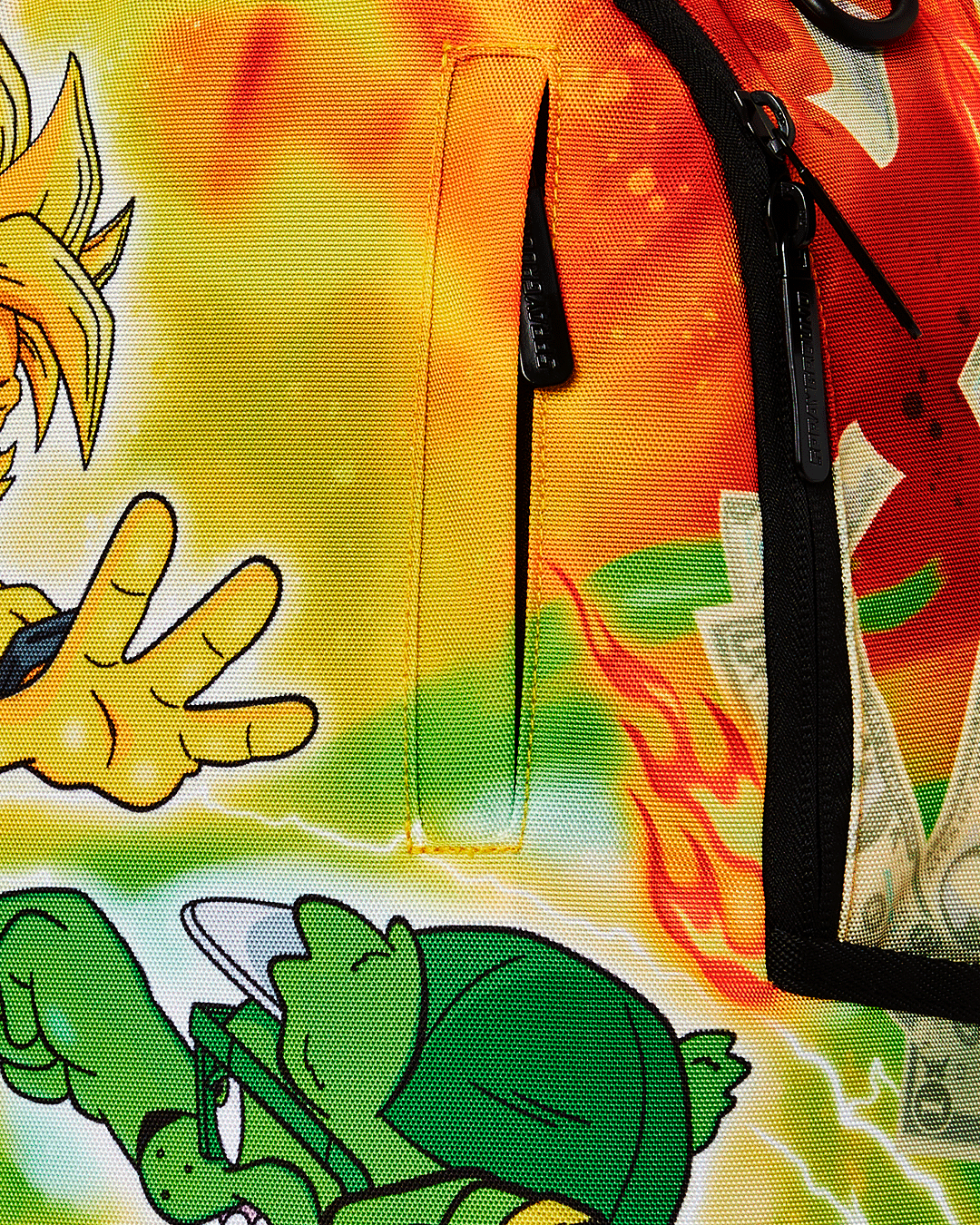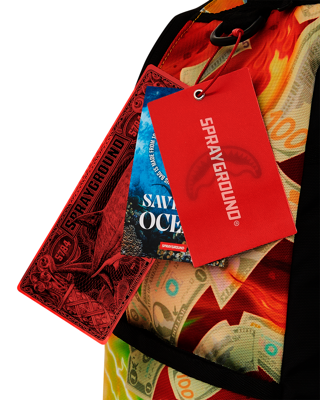 Dimensions: 18" x 6" x 11.5" • Front zipper pocket • Side pockets • Zippered Stash pocket • Separate velour sunglass compartment • Ergonomic mesh back padding • Adjustable Straps for custom sizing • Gold zippers with metal hardware • Metal "Sprayground Authentic" badge • Slide through back sleeve connects to carry-on luggage to free your hands