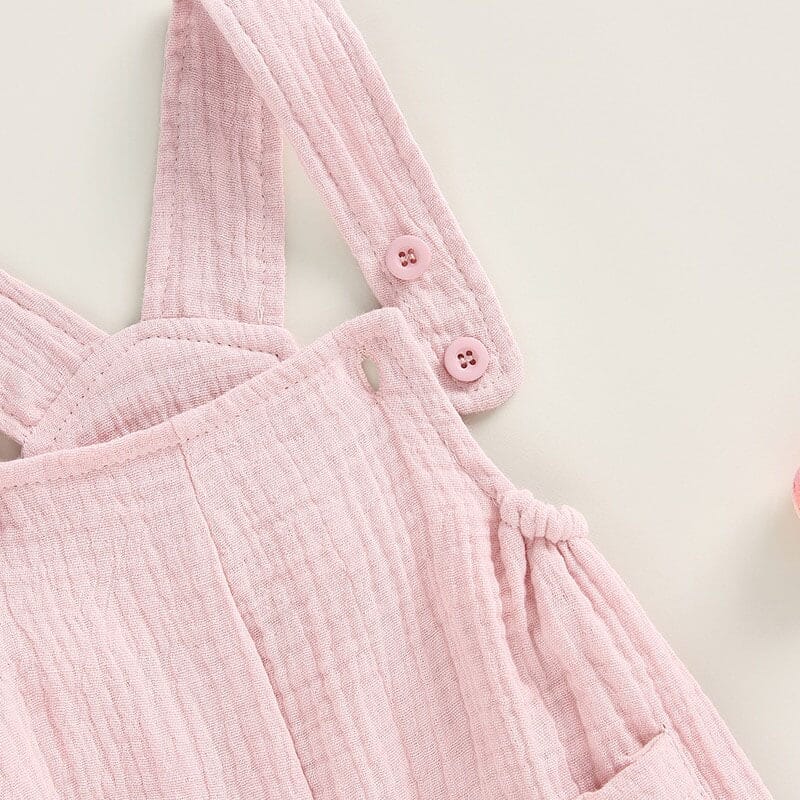 Dress your little princess in this adorable sleeveless pink linen jumpsuit. Made with soft and breathable fabric, it ensures comfort all day long. The suspenders add a cute and playful touch, while the two front pockets provide a convenient place to store small essentials. The jumpsuit features a sleeveless design, perfect for warmer days, and a button closure for easy dressing and diaper changes.
